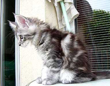 Voilà notre dernière petite puce arrivée à la maison. T'Hara est câline est très joueuse. Elle est très developpée pour son âge avec une excellente charpente, une tête très typique avec de très grandes oreilles très haut placées munies de magnifiques lynx tips. Son museau est long avec un bon profil et un menton très puissant. 3,5 months Now my little mouse is now at home. She's a purry girl. She's very developped for her age with powerful body, a typical head with very large ears high placed with wonderful lynx tips. A big long squarred muzzle, nice profil with a very strong chin. |